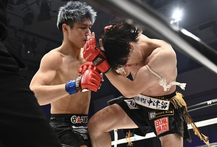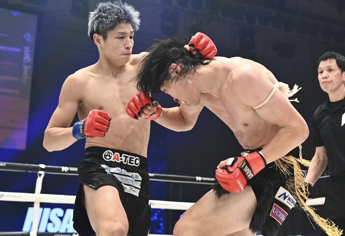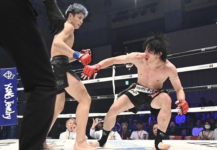古村の右をかわしてジャブと左ストレートを打ち込んで行く久井は、右をかわしての左ストレートでダウンを奪い返す。左三日月を突き刺し、左ストレート、ワンツー、バックキックと猛攻の久井。長いジャブを打つ久井に古村は右を打って前へ出るが、久井は首相撲からのヒザ。古村の顔が血で真っ赤に染まり、左目付近も腫れあがる。