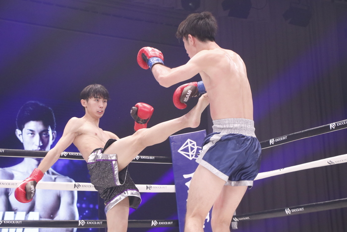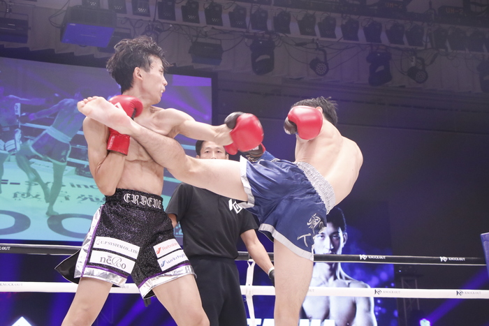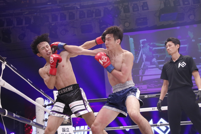 1R、ステップで回り込んだ富田を北島が追いかけてきたところで、富田がスイッチしての左ストレートでダウンを奪う。その後は両者慎重に富田は右ミドル、サウスポーの北島は左ミドルを蹴る。
