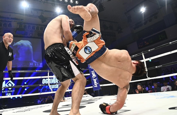 1R、中島は鋭い右ハイキックで先制、小川はニヤッと笑う。小川も内廻し蹴りを放つが中島がブロック。右カーフの中島に小川は右ミドル、右カーフも返す。中島がジャブから右ハイも空振り。中島がワンツーから左ミドル、小川も負けじとワンツーから左ミドルを返す。右フックをヒットさせた中島はパンチをまとめにいくが、小川はステップで離れる。
