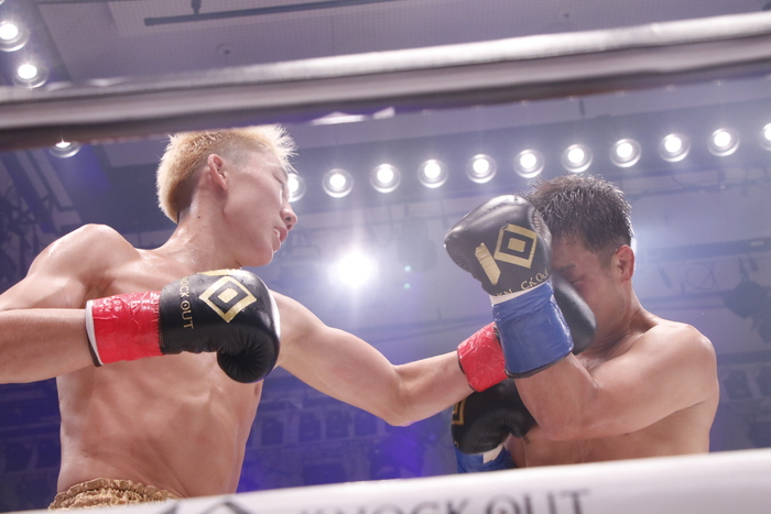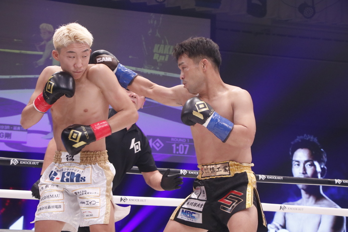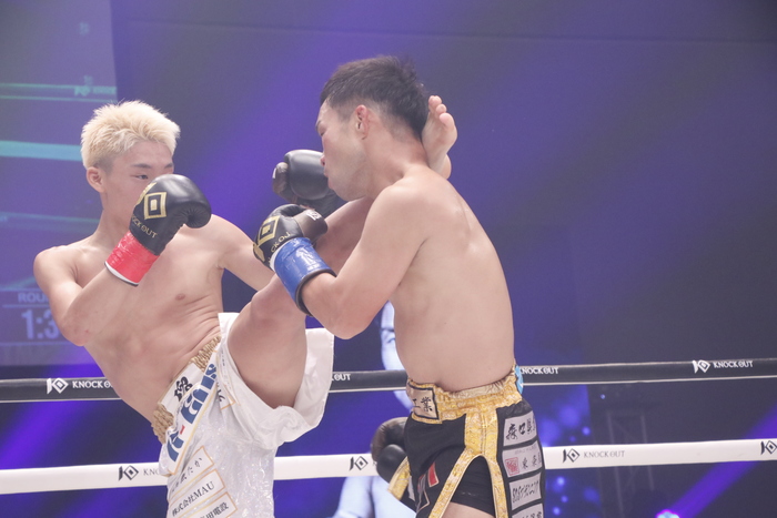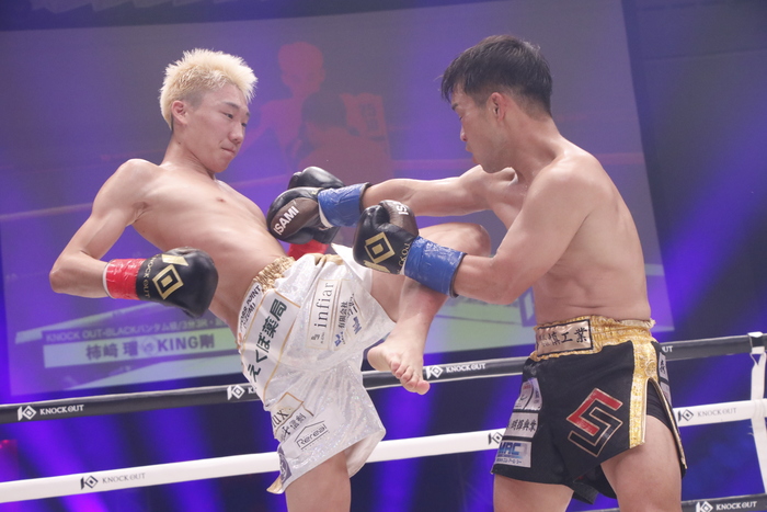 1R、序盤は柿﨑が右カーフと右ストレートでペースを握っていたが、中盤からKING剛がパワフルな左右フックの猛攻。柿﨑はつかんでのヒザで応戦。