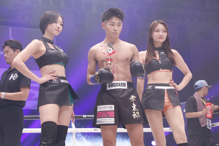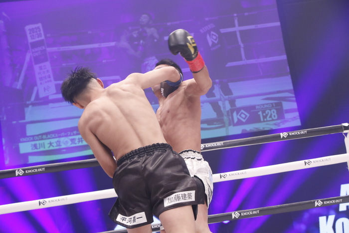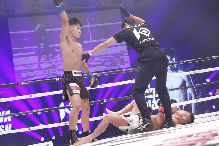 1R、いきなり右カーフを蹴り込んでいく荒井に、浅川は早くもダメージを感じさせる。荒井が右ストレートでダウンを奪い、立ち上がった浅川に右フックで2度目のダウンを追加。立ち上がった浅川だがふらつき、レフェリーがストップした。