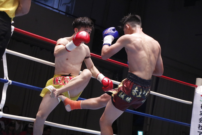1R、赤土が鋭い左フック、左ボディを打つと応援団からどっと歓声が沸き起こる。赤土が左ボディからの組みヒザ連打に持ち込むと一方的な展開になるかと思われたが、荒谷が左フックとヒジで応戦して巻き返す。
