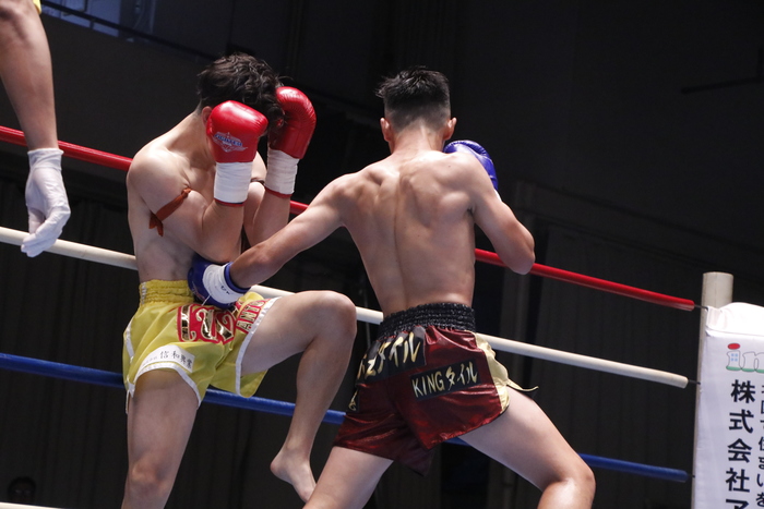 2R、赤土がパンチを出した後のガードの甘さを突いて荒谷が左右フックを当てると、赤土はならばとミドル&ロー。すると荒谷もローを蹴り返してくる。