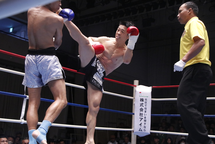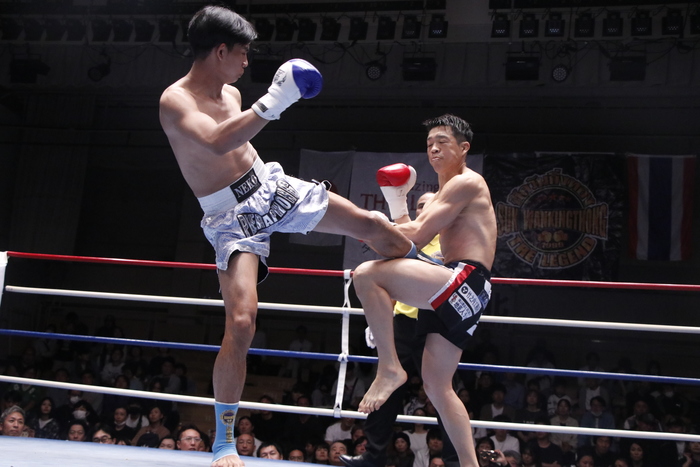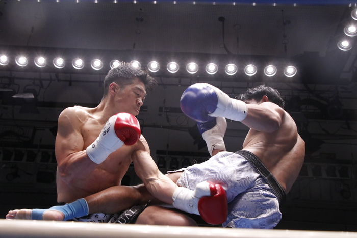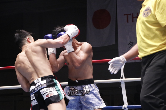 1R、健太は右インロー、ピラポンは左ミドルを蹴り合う中、健太がパンチを繰り出すとピラポンは明らかな左ヒジ狙い。健太のボディストレートに左ヒジを合わせ、危ない場面も。