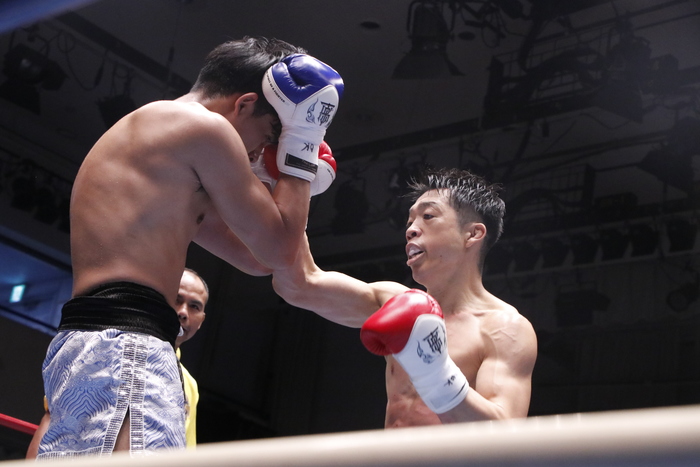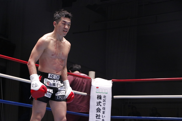 2R、健太が手数を増やしてパンチで攻め込んでいく。左ミドルを蹴られても構わず前へ出て細かいパンチの連打。健太のパンチが捉える場面もあるが、ピラポンは淡々と左ミドルを蹴る。しかし、ラウンド終了間際にピラポンの左ヒジがヒット。ゴング後に健太の右目付近から血が流れた。