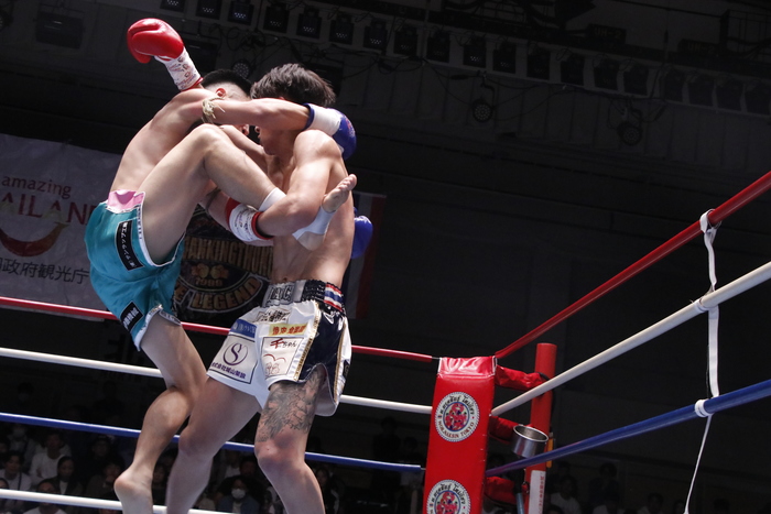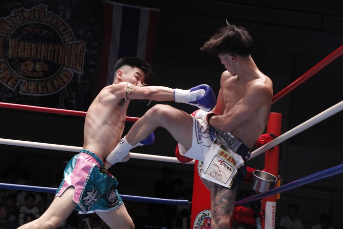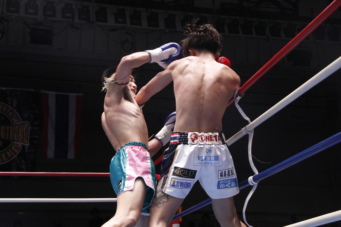 2Rもロープを背負って左ミドルを蹴る須藤に、樹は左右フックで何度もアタックし、フックを当てる。須藤の蹴りに対して樹の攻撃の多さが目立つ。