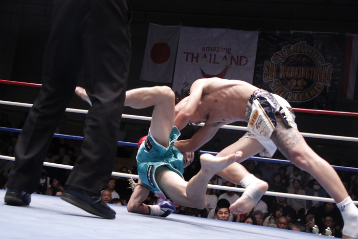 1R、須藤はロープを背負いながら左ミドルと関節前蹴り。樹は圧をかけながらパンチを狙う。須藤が豪快に転倒させれば、ラウンド終了前に樹も須藤を転倒させた。