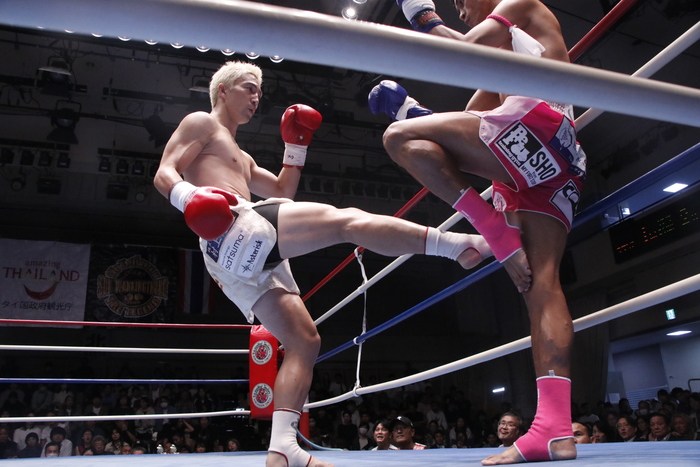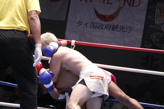 1R、岩城は右インローと右インカーフを蹴っていき、ブーンはロープを背負って左足を上げ始める。岩城はボディストレート打ち、パンチ主体に変える。