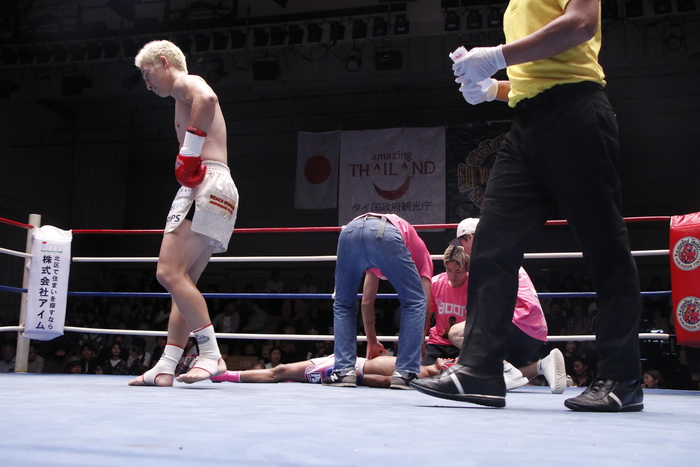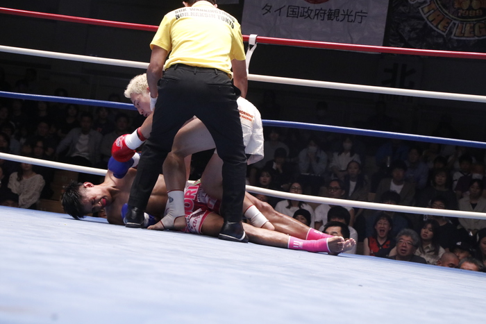 組みの状態となり、岩城が組み倒し際に左ヒジをブーンのテンプルに叩きつけると、倒れたブーンはそのまま立ち上がることが出来ず。岩城の見事なTKO勝ちとなった。