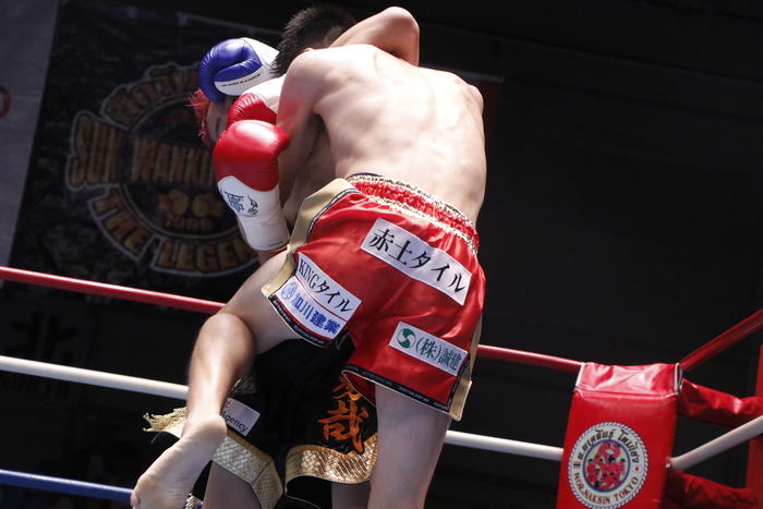 3R、左ミドルから徹底して組みヒザの赤土に、安河内は左カーフと左右フック。組まれる安河内はヒジも打つ。途中で左ミドルを連打して前へ出た赤土だが、安河内にパンチを合わされるとすぐに組みヒザ。