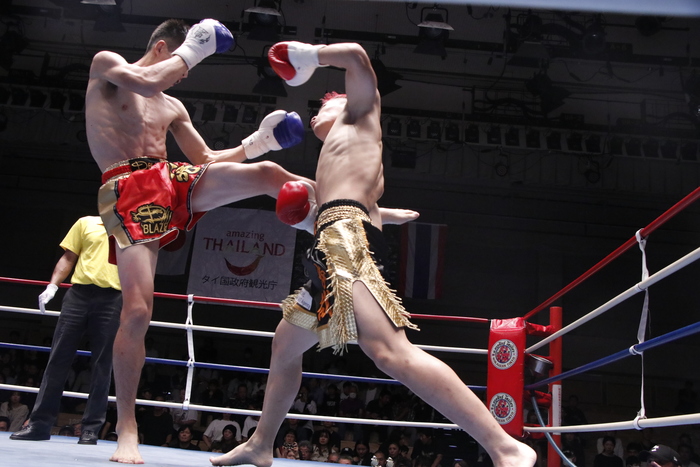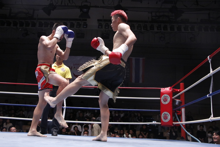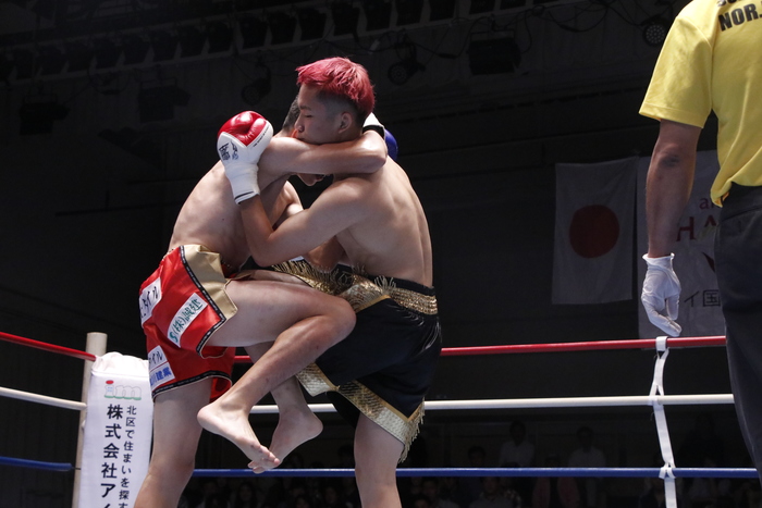 1R、サウスポーの赤土は左ミドルから首相撲のヒザを徹底して行う。安河内もヒザを蹴り合い、離れると左カーフと左右ストレート。