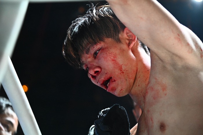 谷津は左ボディと右フックで勝負をかけるが、オムも右を打ち返して組んでくる。顔面血だらけの谷津はワンツー、左右フック。オムも右ストレートを返して谷津をのけ反らせる。