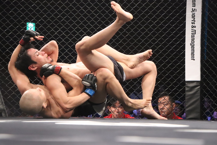 2R、梅木は右インローを当ててテイクダウン狙いも、左で詰める平良がボディロックテイクダウンからバック。背後からパウンド。正対する梅木の組みを潰してトップからバックを奪う平良が肩固めに入りゴング。