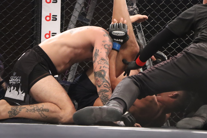 1R、ともにオーソドックス構え。詰めて首相撲のミキに引き込み下になった水嶋は三角絞めに。中腰で外そうとするミキだが、水島は足をすくうと、またごうとするミキに正対して絞めて極めた。