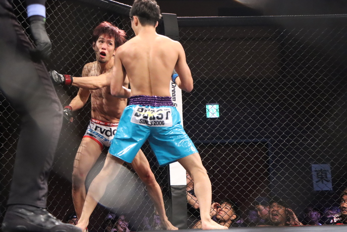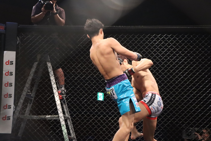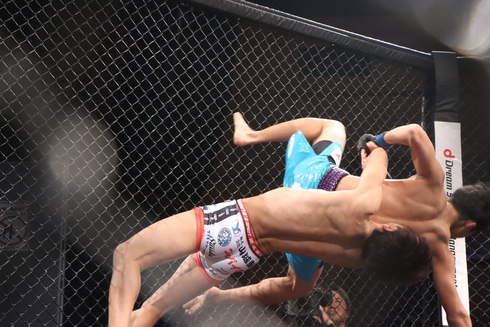 1R、サウスポーの福島はスーパーマンパンチ。オーソの砂辺は組んでボディロックテイクダウン。立つ福島をジャーマンで投げる。なおも立つ福島にヒザを突く砂辺。正対した福島がテイクダウン。砂辺も立つと前転して逃げようとするがついていく福嶋。
