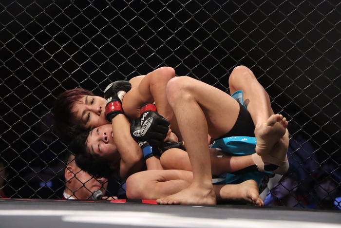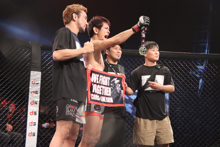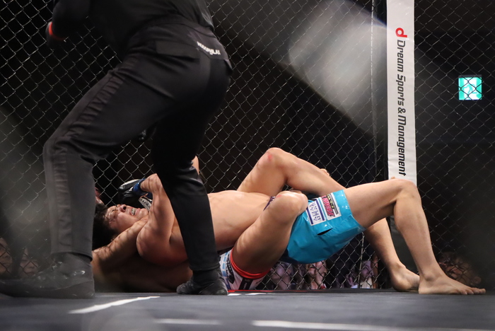 スタンドで入る福島に砂辺の左がヒット! ぐらついた福島だが組むと砂辺は今度はバックドロップ。ハーフからリアネイキドチョーク狙いで四の字。福島は正対にパウンド。立つ砂辺はボディロックからテイクダウン。マウント。四の字バックからリアネイキドチョーク。最後はパームトゥパームで極めた。