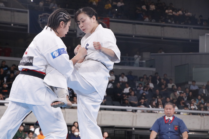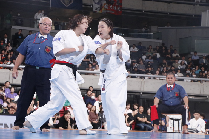 両者突き中心の打ち合いとなり、後半やや手数が多かった藤原が判定1-0。延長戦でも同じく打ち合いとなり、ここで藤原が右下段廻し蹴りを決める。目代もヒザを使うが突き一辺倒の目代よりも攻撃のバリエーションを増やした藤原が優勢。最後は胸を着けるようにして突きを打った藤原が押し切り、判定勝ちとなった。