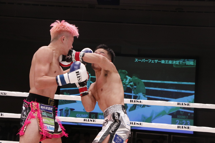 2R、右ローを蹴るGUMPは余裕が出たかノーダメージポーズ。これに怒ったか常陸は右フックを連打。ここから常陸が圧をかけて右の強打を何度も叩き込む。終盤には右フックでダウン寸前まで追い込んだ。
