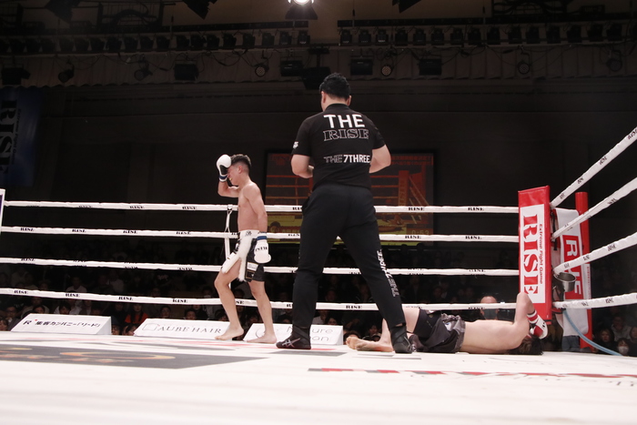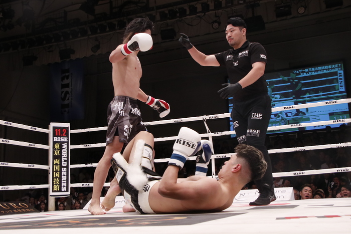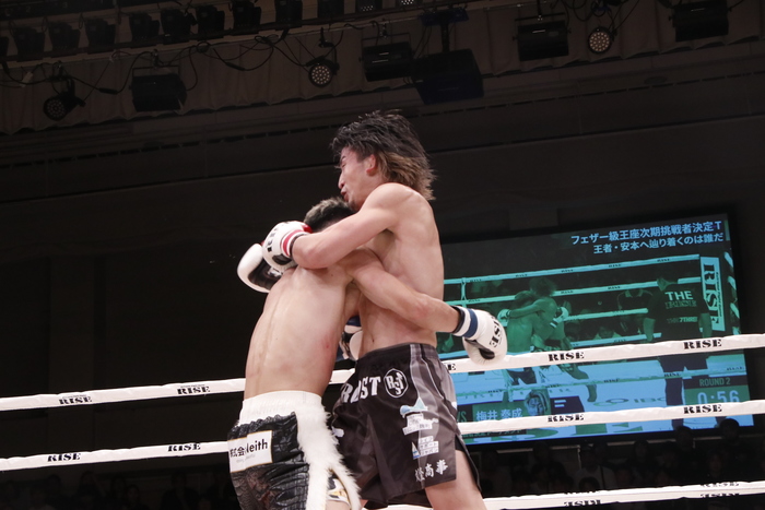 1R、左フックと右インローの吉田に梅井は左ミドルで対抗。入り込んで一気にパンチをまとめる梅井が、左フックでダウンを奪う。