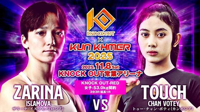 大将戦にはKNOCK OUT-RED&BLACKスーパーバンタム級統一王者の森岡悠樹(北流会君津ジム)が登場するほか、7月大会に初来日してNANAに大差の判定勝ちを収めたザリーナ・イスラモバ(ロシア)がKNOCK OUTチームに加わった。