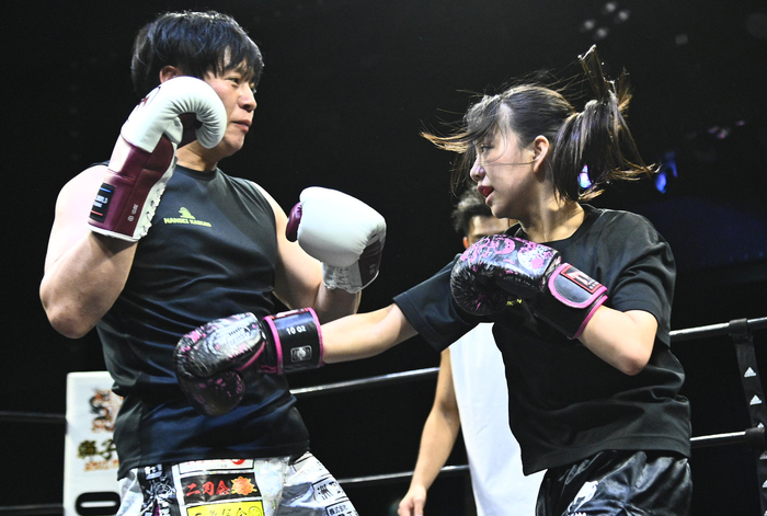 11月2日の「RISE WORLD SERIES 2025 FINAL」でプロデビュー戦が決まった綾芽と父のSIGによる親子ガチスパーリング。お互いに容赦ない打撃を交換し、会場を温めると、次に北野ひなたが登場。綾芽は北野と白熱するスパーリングを行った。マイクを握った綾芽は「皆さんのおかげで掴んだチャンスなので、いい試合をしていい結果を出すので応援よろしくお願いします」とあいさつした。