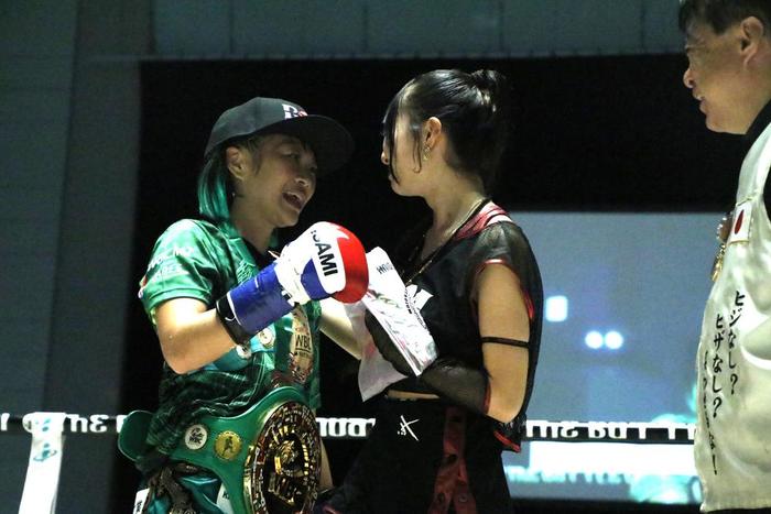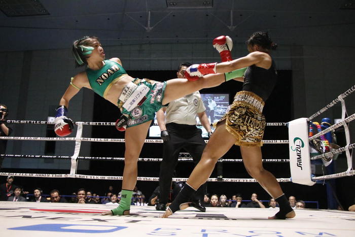 藤原乃愛(左)の顔面前蹴り動画が世界で大バズり(※写真は日本での試合のもの)