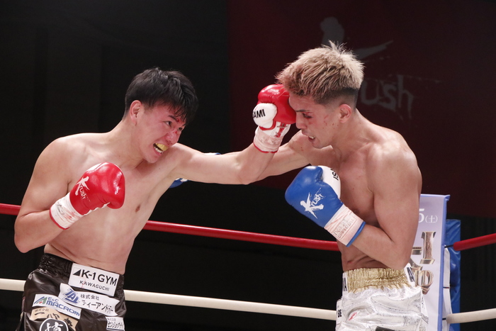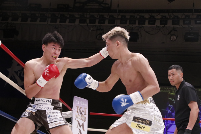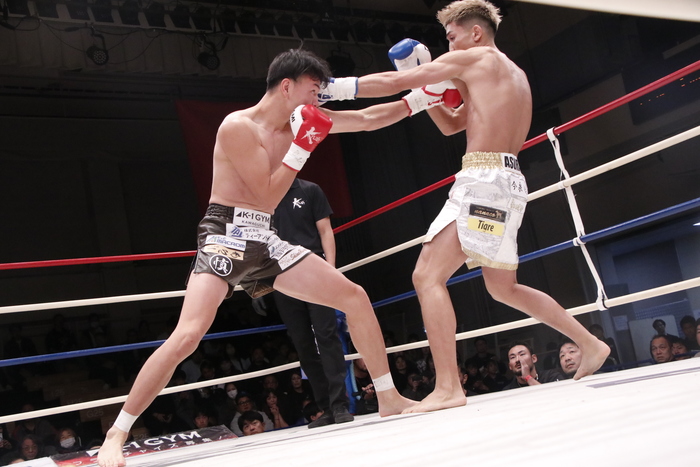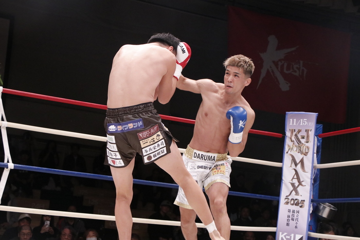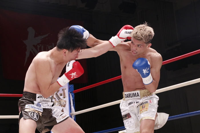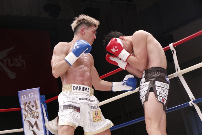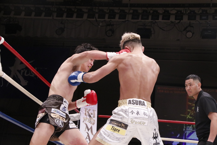 1R、互いに右カーフを蹴り、今度は相手の右カーフにパンチを合わせに行く両者。DARUMAが右強打を放つと、それでスイッチが入ったように一気にラッシュをかける齋藤。そのラッシュが止まったところでDARUMAはボディを攻めていく。さらに右強打を当てていくDARUMA。