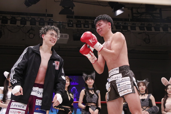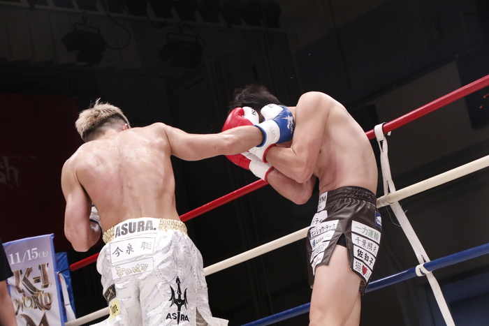 3R、打たれては打ち返す、打って打たれつの展開が3分間続いた。前に出るのは齋藤だが、DARUMAも一歩も退かず打ち合い、意地の張り合いのような殴り合いに。それが最後まで続き、決着は判定にもつれ込んだ。