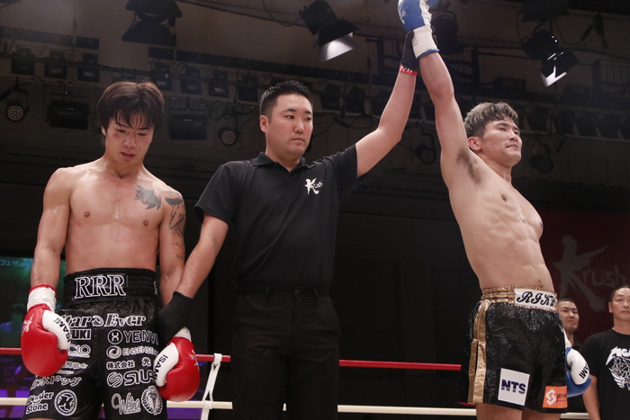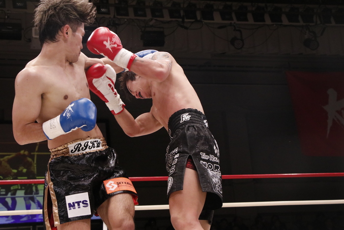 3R、パワフルなワンツーを打つ立基だが、山本はワンツー、左右フックと手数が多い。ジャブ、ワンツー、左右フック、左ボディと手数を増やしてヒットも奪っていく山本は、終盤には内廻し蹴り、飛びヒザ蹴り、バックハンドブローと大技で印象付ける。