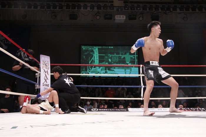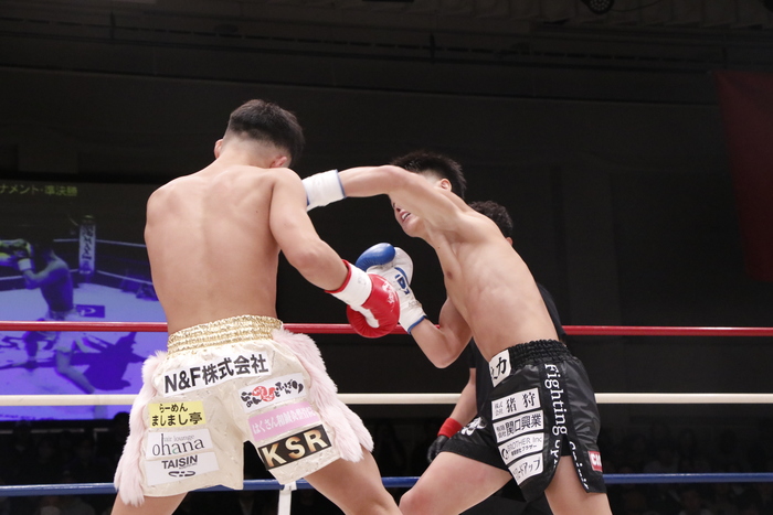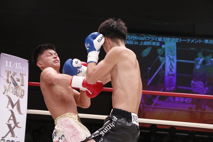 最後はコーナーへ圧をかけていき、海凪が放った右フックに右フック合わせて壮絶なKO。上遠野が優勝候補らしい圧勝で決勝へ駒を進めた。