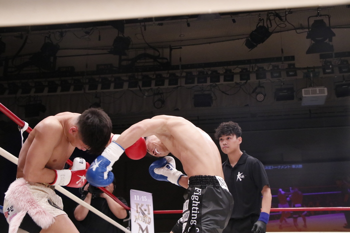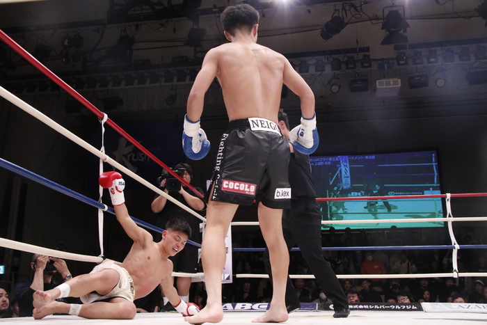 1R、サウスポーの両者はジャブの打ち合い。海凪が左右フックでペースを掴み始めたかと思われたところで、上遠野が右ボディからの右フックでダウンを奪う。