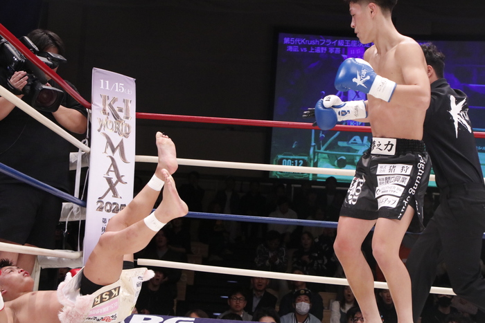 立ち上がった海凪に上遠野は圧をかけていき、三日月蹴りから振りかぶっての左フックでダウンを追加。