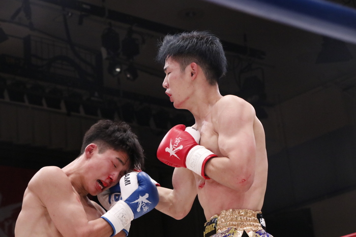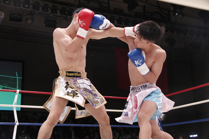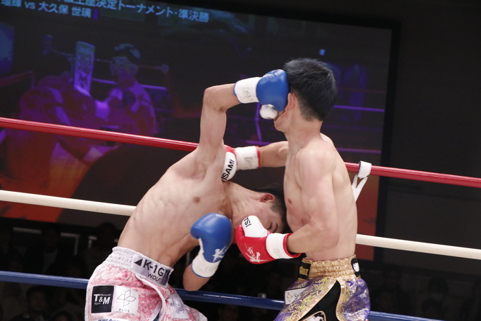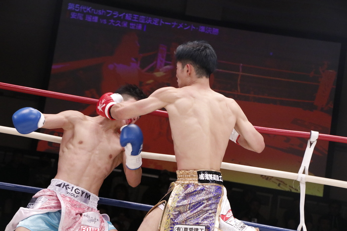 2R、大久保の蹴りに対して左右フックを回転させていく安尾。打ち合いで安尾の右フックに巻き込まれる形で大久保が倒れるが、これはスリップ判定。その後もハイスピードで打ち合いを展開していく両者だが、安尾の強打のヒットが目立った。