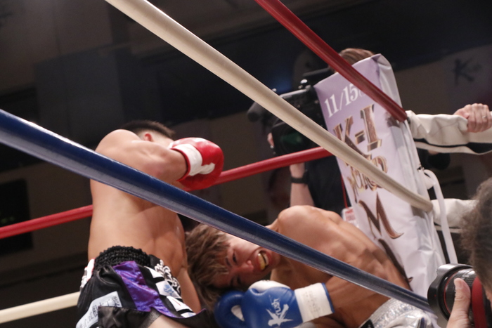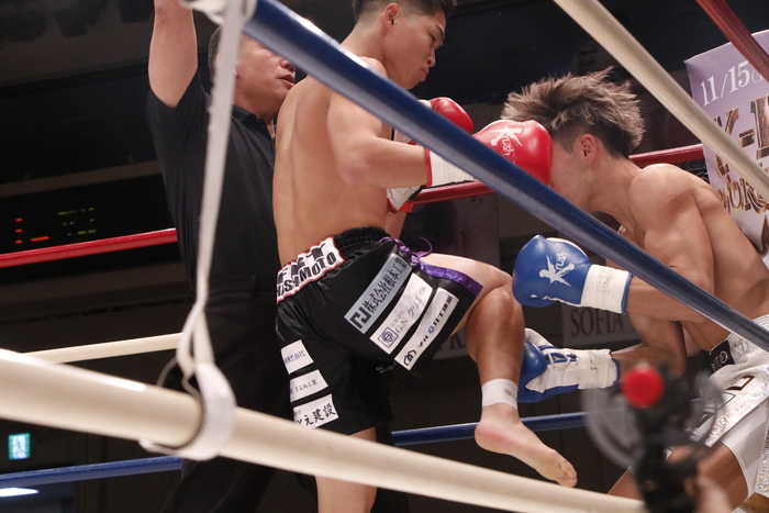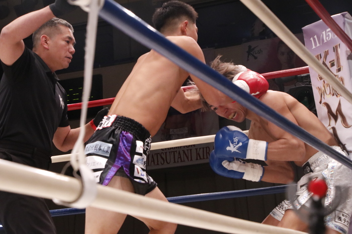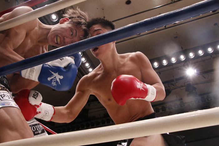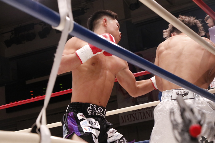 1R、右カーフとジャブの応酬から、橋本が左フックからの左ボディをヒットさせると内田が下がり、橋本が左ボディを叩き込むとダウン寸前に。コーナーへ詰めての連打で一方的に橋本が攻め込み、アゴへのヒザでダウンを奪う。内田はこのラウンド持ちこたえた。