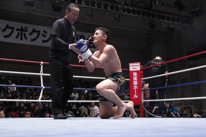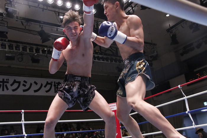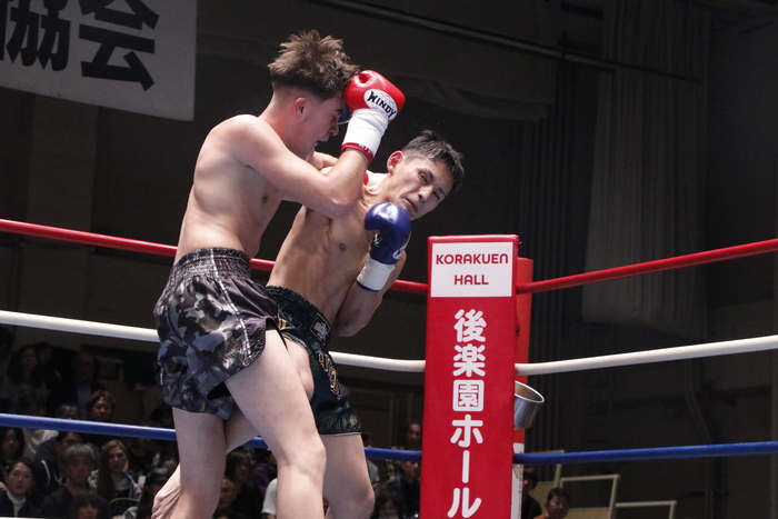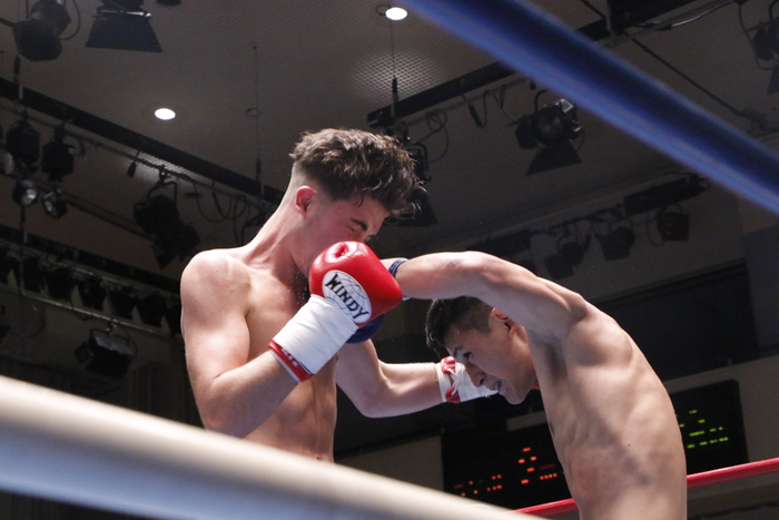 1R、序盤はサウスポーの篤志が左ストレートと組みヒザで優勢だったが、中盤を過ぎるとカサドが右ストレートで逆襲。前へ出ていく。