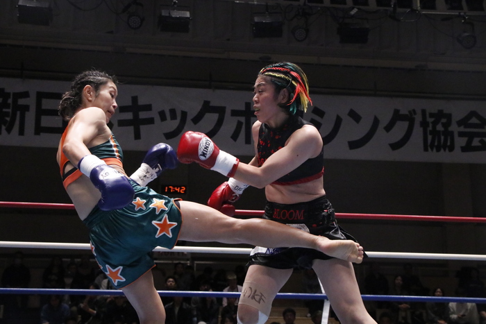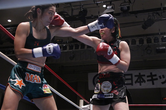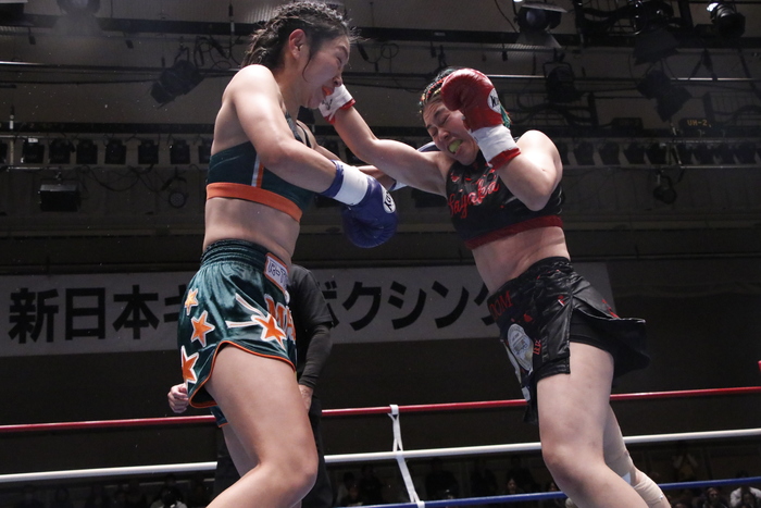 1R、組んでのヒザ蹴りに持ち込む松藤に紗耶香は左右フックの連打で応戦。パワーで優る紗耶香のパンチが目立った。