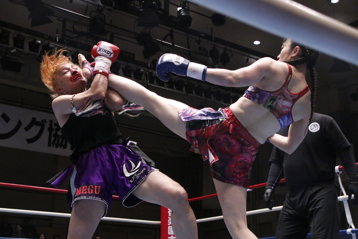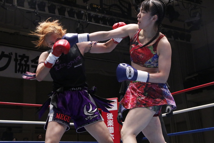 1R、MEGUは首相撲からのヒザを仕掛けるが、離れると朱乃へ右ストレートを直撃。さらに顔面前蹴りで鼻血を出させる。