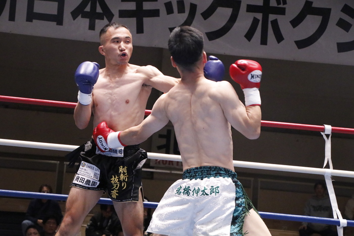 2R、左ボディを当てる岩橋だが、岡田のワンツー、左フックを被弾。岩橋は左ミドルを多用して岡田の右腕を蹴っていく。岡田もローを蹴り返し、互いに相手の攻撃をもらいながらも返していく。