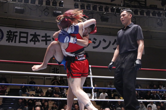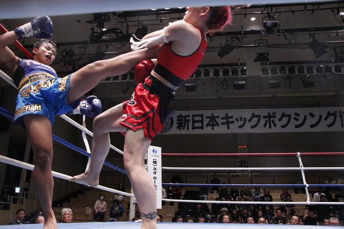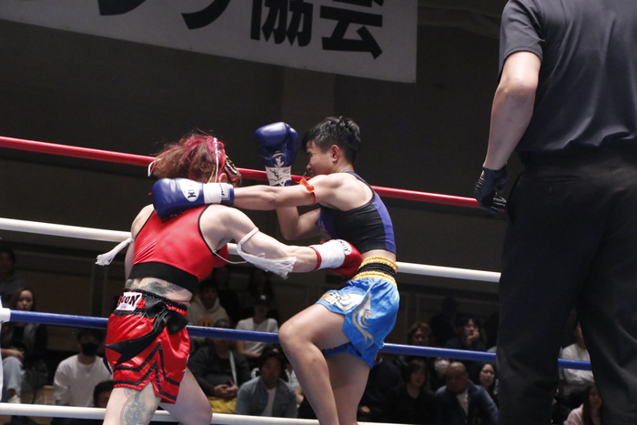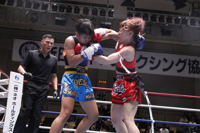 1R、佐藤は右インカーフと左カーフを蹴り、組んで首相撲に持ち込む。マフィアも組むとヒザ蹴り。組んでの勝負は互角。