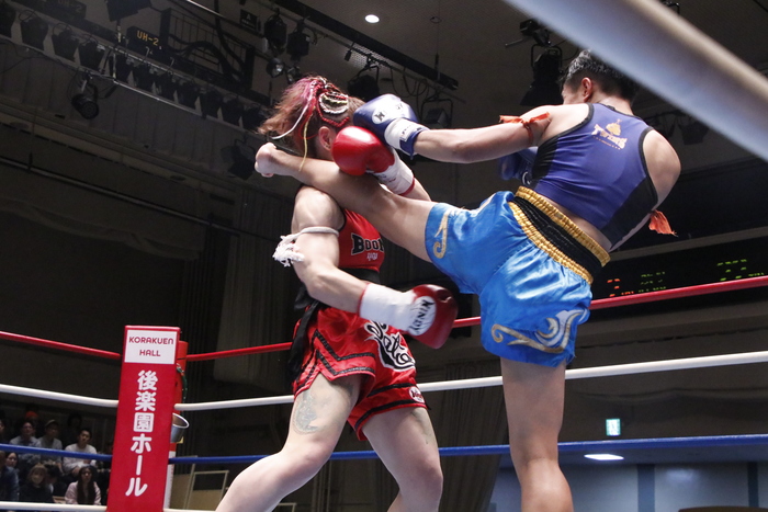 2Rになるとマフィアは左ミドルを多用。左ミドルを次々と当てていく。佐藤はフックから組み付いて首相撲に持ち込むが、マフィアは膝頭をしっかりと突き刺すヒザ蹴り。佐藤がヒザを蹴り返そうとすると崩し倒す。