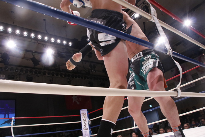試合は斎藤がハイキックと左右フックで前へ出ようとするが、松山が前足への前蹴りを多用してその前進を阻止。さらに松山は左右ロー、インロー、ミドル、接近するとヒザ蹴りと蹴り技を多用、斎藤が前へ出てくると左ストレートで迎え撃つ。