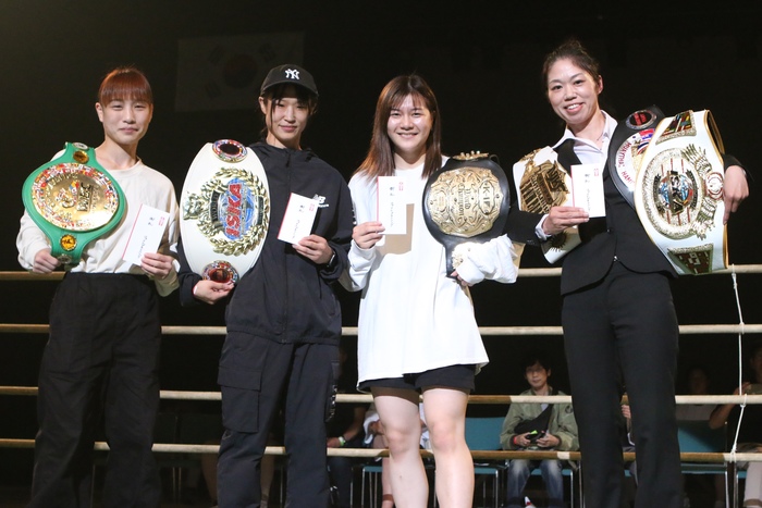 第8試合の後には、ミネルヴァから世界のタイトルを獲得した女子王者たちがリングに勢揃い。8月にオーストラリアでWBCムエタイ女子ミニマム級世界王者になった撫子(ミネルヴァ2階級王者)、6月に同じ会場でISKA世界女子アトム級王者になったMARI(ミネルヴァ3階級王者)、K-1女子フライ級王者・SAHO(元ミネルヴァ・スーパーフライ級王者)、そして元ISKAムエタイ女子アトム級世界王者・白築杏奈(ミネルヴァ2階級王者)の4人がベルトを肩に集結し、リング上から挨拶を行った。