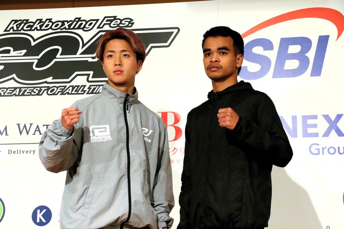 第7試合のRISEルール53.5kg契約3分3R延長1Rで対戦する、那須川龍心(TEAM TEPPEN)とチャラームダム・ナヨックエータサラ(タイ/NayokAThasala GYM)が計量をパスし、記者会見に出席。