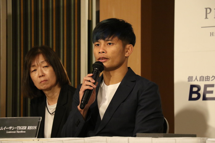 第5試合のKNOCK-OUT BLACKルール60kg契約3分3R延長1Rで対戦する、ロムイーサン・TIGER REON(タイ/REON Fighting sports GYM)と龍聖(BRAID)は共に計量をパスして会見に出席。