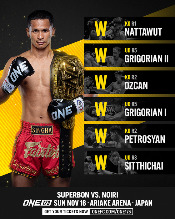 2025年11月16日(日)東京・有明アリーナ『ONE 173』(U-NEXT配信)のメインイベントにて、ONEフェザー級(※70.3kg)キックボクシング世界王座統一戦3分5Rで暫定王者の野杁正明(team VASILEUS)と対戦する正規王者スーパーボン(タイ)の新たなインタビューがONE公式サイトにて公開された。