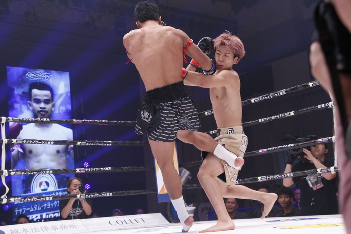 1R、ジャブを突いていく那須川にチャラームダムは右ロー、前蹴りを合わせに来る。一気にスピードを上げる那須川が左ボディを決めるとチャラームダムは後退。