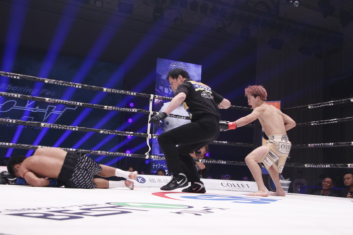 続いて左ボディを直撃させた那須川は、右のバックキック! この一発が見事に決まり、チャラームダムは悶絶してダウン。那須川の見事なKO勝ちとなった。