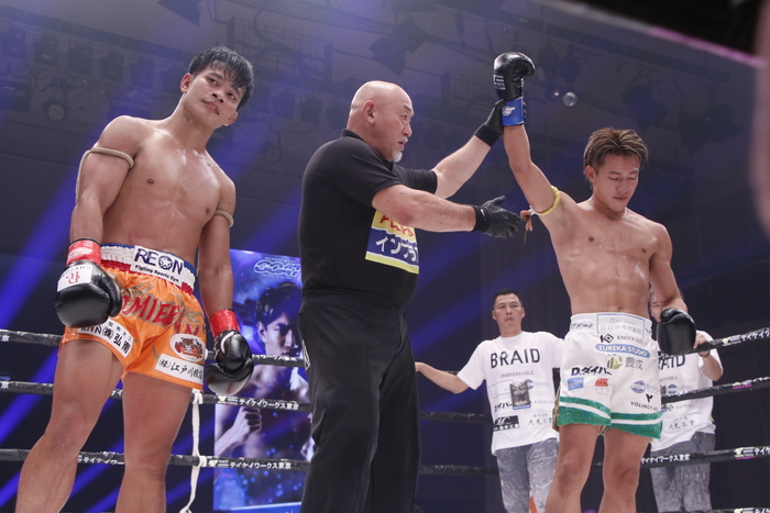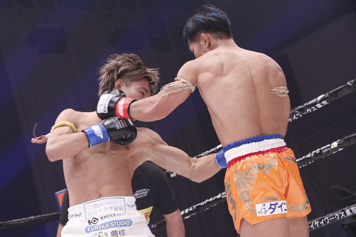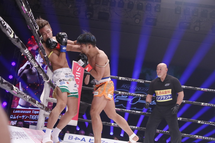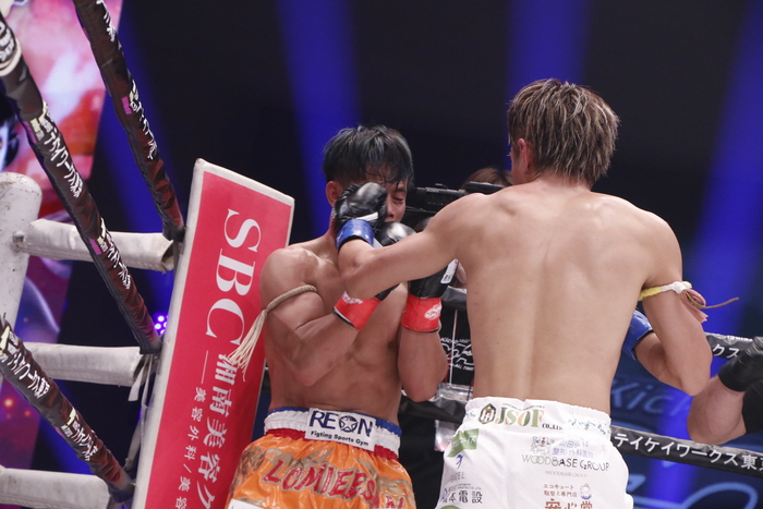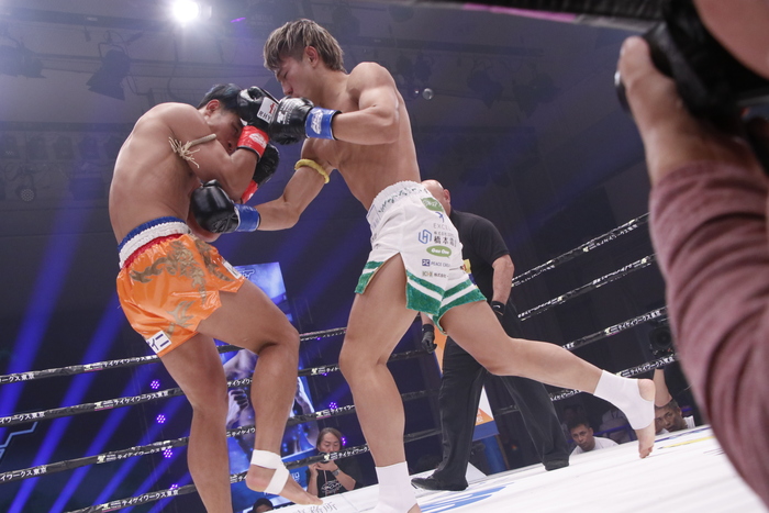 2R、龍聖が左右ボディ、左三日月蹴りで手数多くボディを攻めていき、カーフも蹴る。ロムイーサンは右ストレート、右ボディの強打で対抗するが、龍聖の左フックがクリーンヒットし、ロムイーサンが下がる。ロープを背負わせて左ボディ連打を見舞う龍聖。