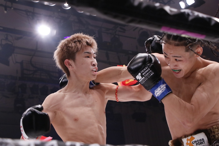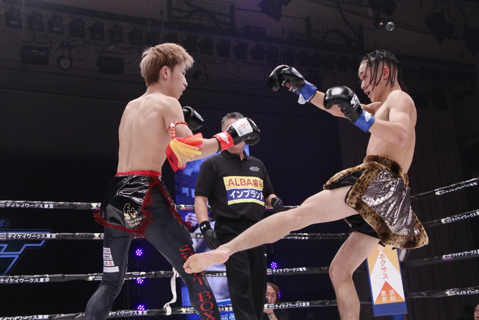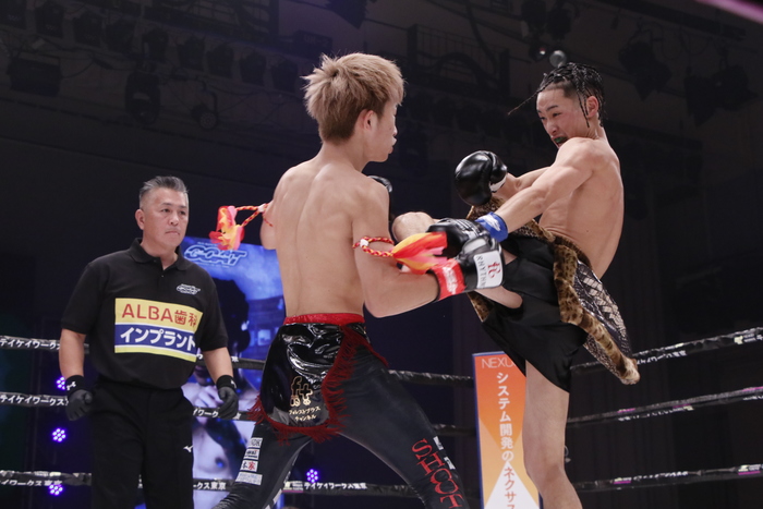 1R、両者ともサウスポーで前蹴りを多用。パンチが交錯すると一発の渡部に対して片山は2発目をフォローする。渡部はトリッキーな蹴り技を使うが片山は見切る。
