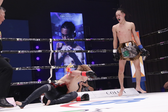 2R、片山が前蹴りからの左ストレートでリズムに乗ってきたと思われた次の瞬間、コーナーへ追いつめた片山が行こうとしたところへ渡部が左ストレートのカウンター。この一発が見事に決まり、片山はダウン。立ち上がろうとしてもフラフラでレフェリーが試合を止めた。
